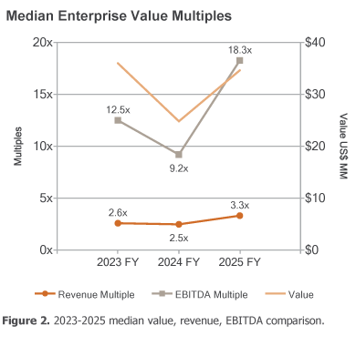 The median revenue multiple increased from 2.5x in 2024 to 3.3x in 2025. The median EBITDA multiple inceased significantly from 9.2x in 2024 to 18.3x in 2025.