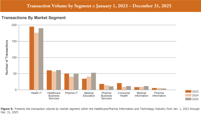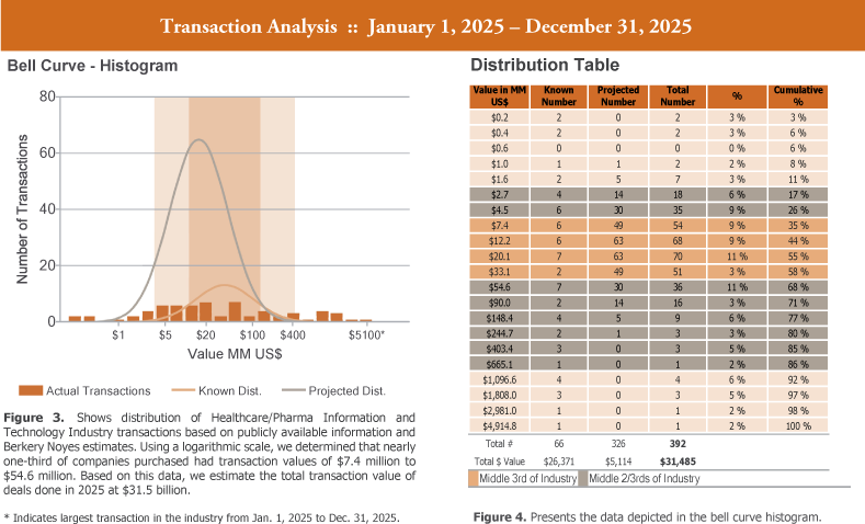 Berkery Noyes tracked 1,137 Healthcare/Pharma Information and Technology transactions between 2023 and 2025, of which 183 disclosed financial terms, and calculated the aggregate value to be $48.8 billion. Based on known transaction values, we project values of 954 undisclosed transactions to be $16.3 billion, totaling $65.1 billion worth of transactions tracked over the past three years.
