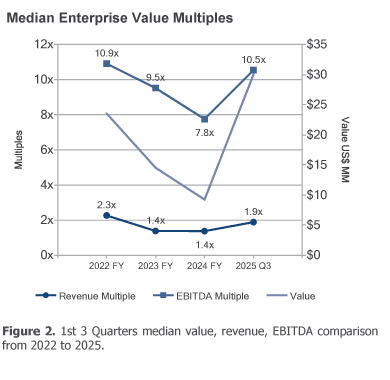 The median EBITDA multiple increased from 7.8x in 2024 to 8.3x in 2025. The median revenue multiple increased from 1.4x to 1.6x.