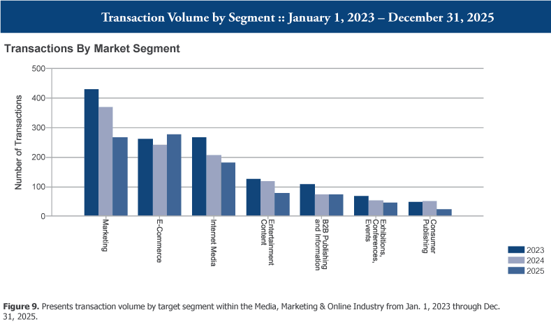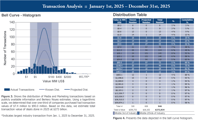 Berkery Noyes tracked 3,374 Media, Marketing & Online transactions between 2023 and 2025, of which 760 disclosed financial terms, and calculated the aggregate value to be $425 billion. Based on known transaction values, we project values of 2,614 undisclosed transactions to be $50 billion, totaling $475 billion worth of transactions tracked over the past three years.
