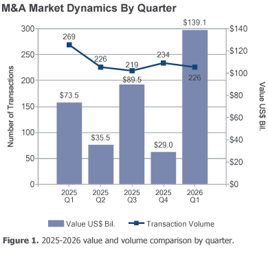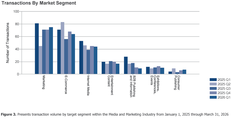 Media, Marketing, & Online transaction volume decreased from 234 deals in Q4 2025 to 226 deals in Q1 2026.