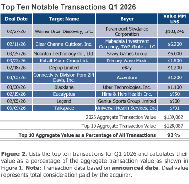 The largest transaction year-to-date in the Entertainment space and the largest transaction in Media, Marketing & Online, was the announced acquisition of Warner Bros. Discovery, a premier global media and entertainment company, by Paramount Skydance Corporation, for $108.2 billion. This transaction replaces Netflix’s $82.7 billion bid for Warner Bros in Q4 2025.