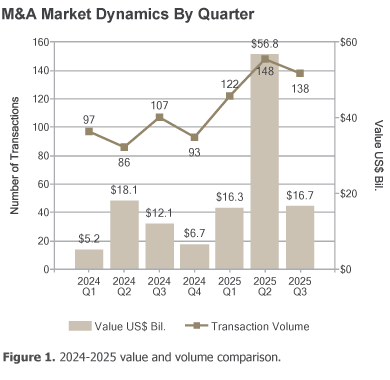 Total transaction value in Q3 2025 decreased more than 3x over Q2 2025, from $56.8 billion to $16.7 billion. This decline is due to the two largest deals year-to-date, with a combined value of $37.8 billion, occurring in Q2 2025. The Q3 2025 transaction value returns closer to Q1 2025 value of $16.3 billion.