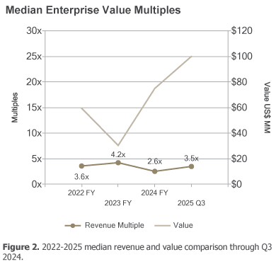 The median revenue multiple from 2024 through the 1st 3 Quarters of 2025 rose 35 percent, from 2.6x to 3.5x.