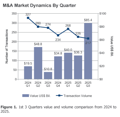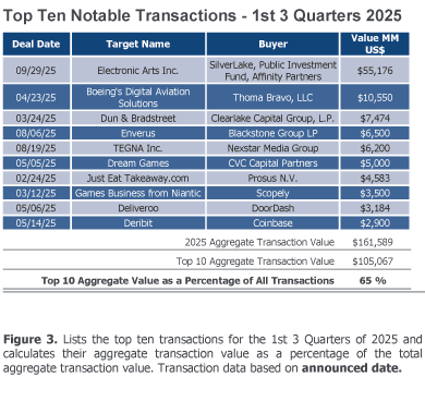 These three transactions, with an aggregate value of $67.88 billion, represented 42 percent of transaction value 1st 3 Quarters of 2025.