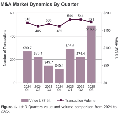 There were 417 financially sponsored transactions in the 1st 3 Quarters of 2025 with an aggregate value of $153.67 billion, representing 26 percent of the total volume and 47 percent of the total value, respectively.