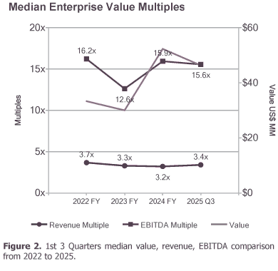 The median EBITDA multiple on a year-over-year basis decreased slightly, from 15.9x to 15.6x.