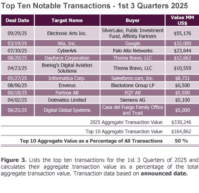 The top ten deals by value have seen four new additions since our half year report. These include the previously mentioned announced acquisition of Electronic Arts by an investor consortium, Palo Alto Networks’ announced acquisition of CyberArk for $24 billion, Thoma Bravo’s announced acquistion of Dayforce Corporation for $13 billion, and Blackstone Group’s announced acquistion of Enverus for $6.5 billion. These four transactions, with an aggregate value of $97.8 billion, represented 29 percent of 1st 3 Quarters 2025 transaction value.