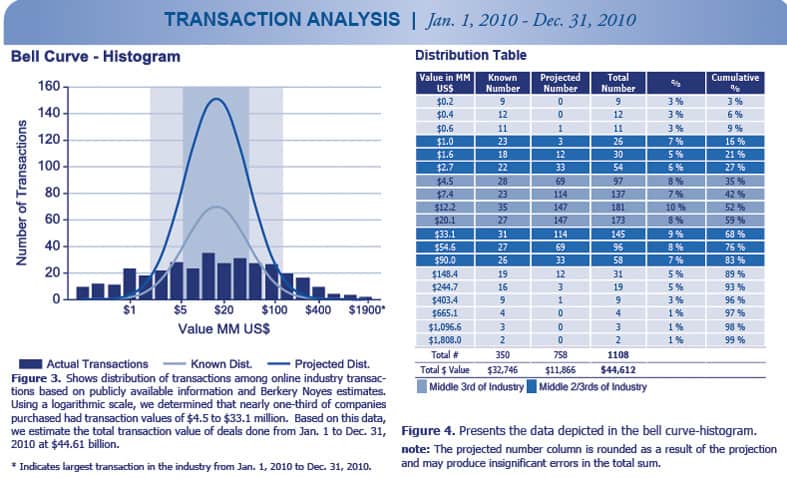 Berkery Noyes tracked 3340 transactions between 2007 and 2010 of which 1128 disclosed financial terms, and calculated the aggregate transaction value to be $127.94 billion. Based on known transaction values, we project values of 2212 undisclosed transactions to be $36.85 billion totaling $164.80 billion worth of transactions tracked over the past four years.