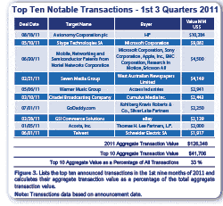 • The largest transaction in Q3 2011 and through the third quarter was HP’s acquisition of Autonomy Corporation plc for $10.28 billion.